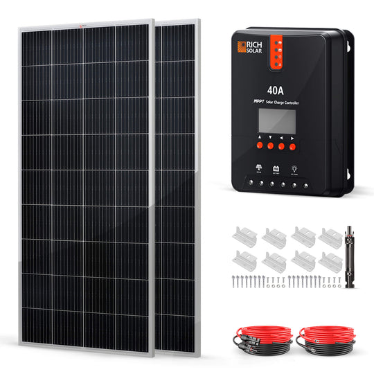 Our most popular 12V solar kit! This 400W system includes two high-efficiency 200W Monocrystalline panels with 9 busbars, paired with a 40A MPPT charge controller that can be expanded up to 600W on a 12V setup....Sale price $699.99Regular price $823.52Sale price $699.99Regular price $823.52 -