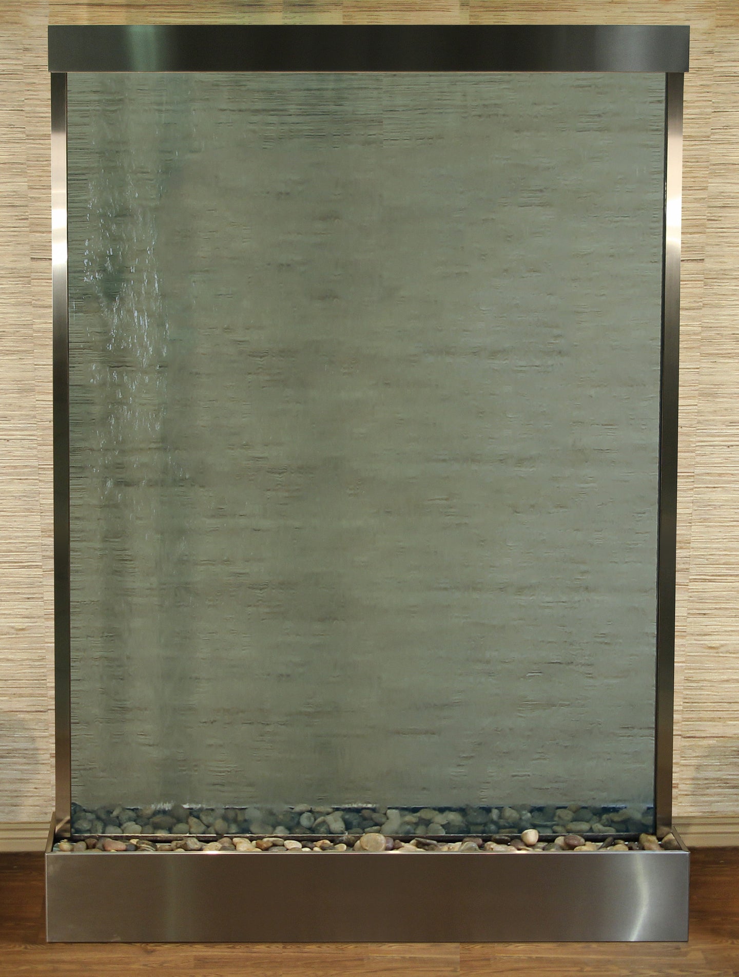 The Adagio Mega Grandeur River is a 10-foot-tall, flush-mounted indoor fountain designed to sit against a wall and create a calm, polished focal point. Hand-crafted in the USA, it pairs a durable powder-coated steel or copper frame with your choice of glass, mirror, or natural stone surfaces and is built for high-traffic lobbies, corporate entrances, retail spaces, or luxury homes.